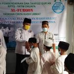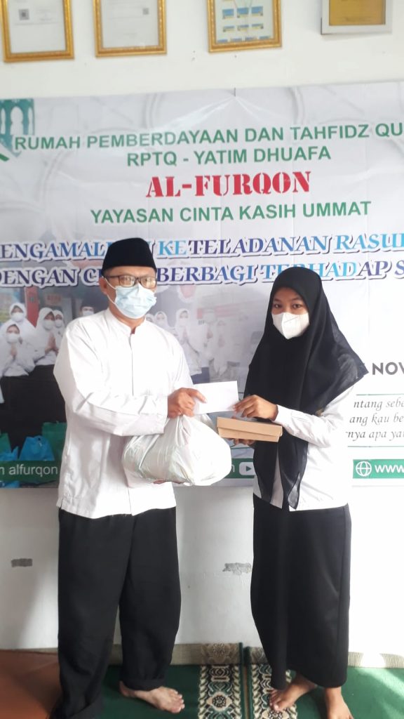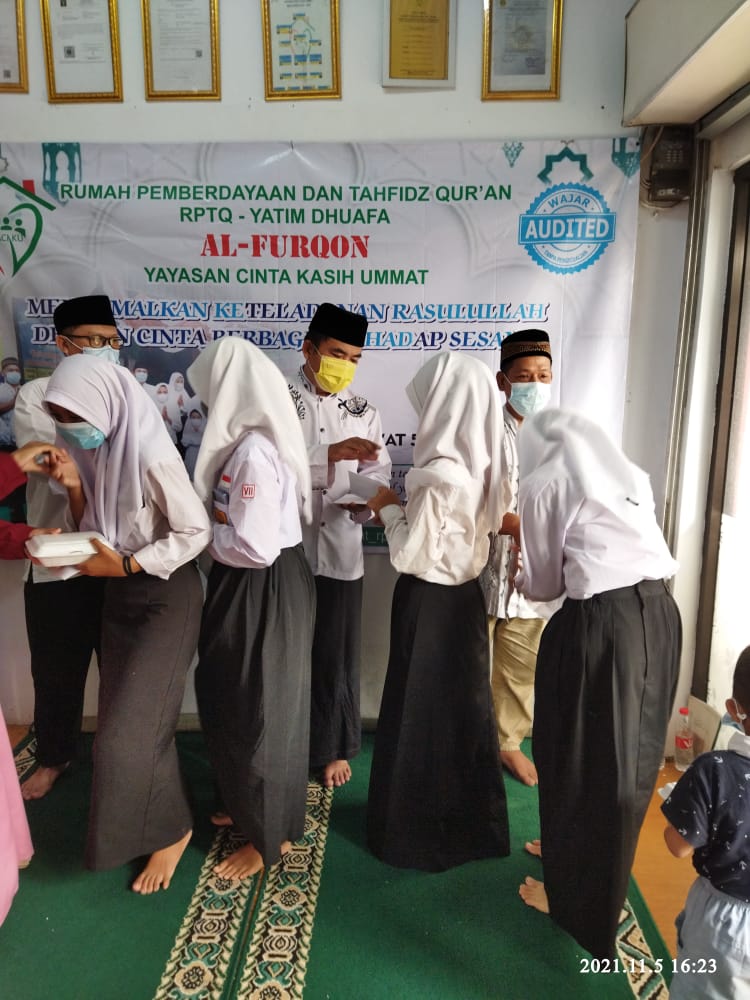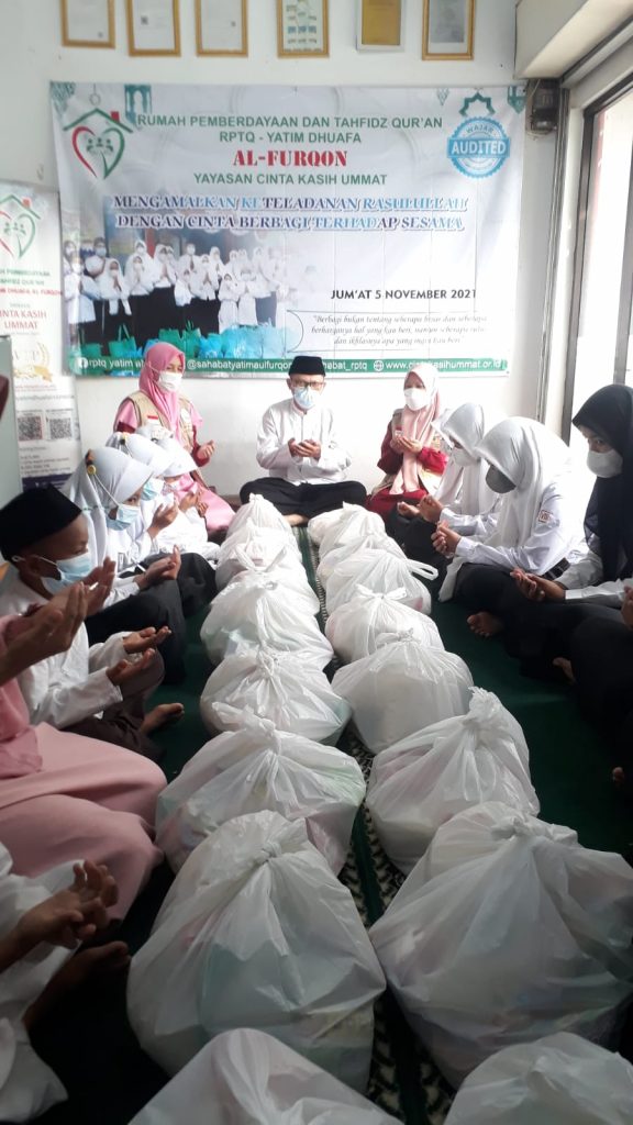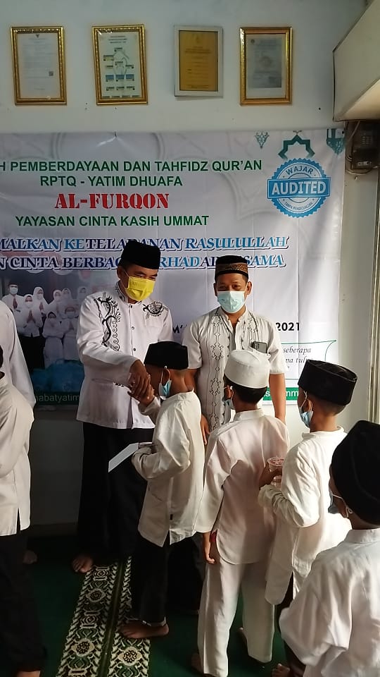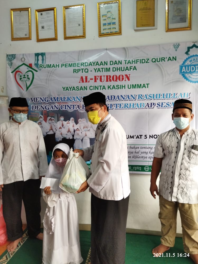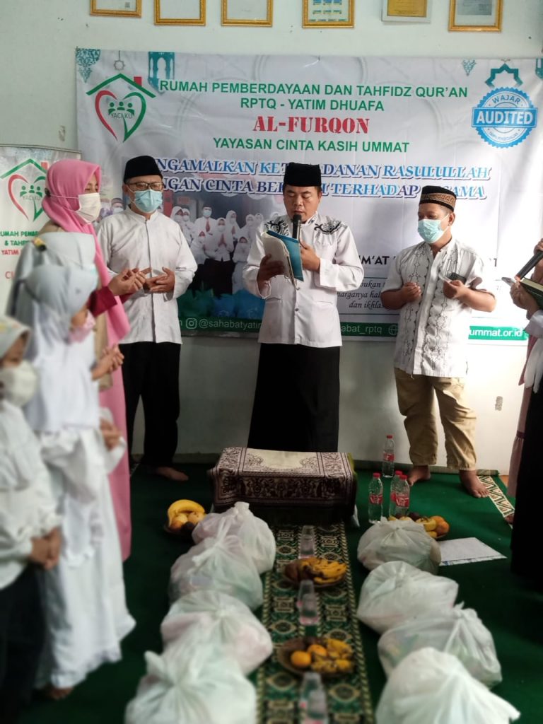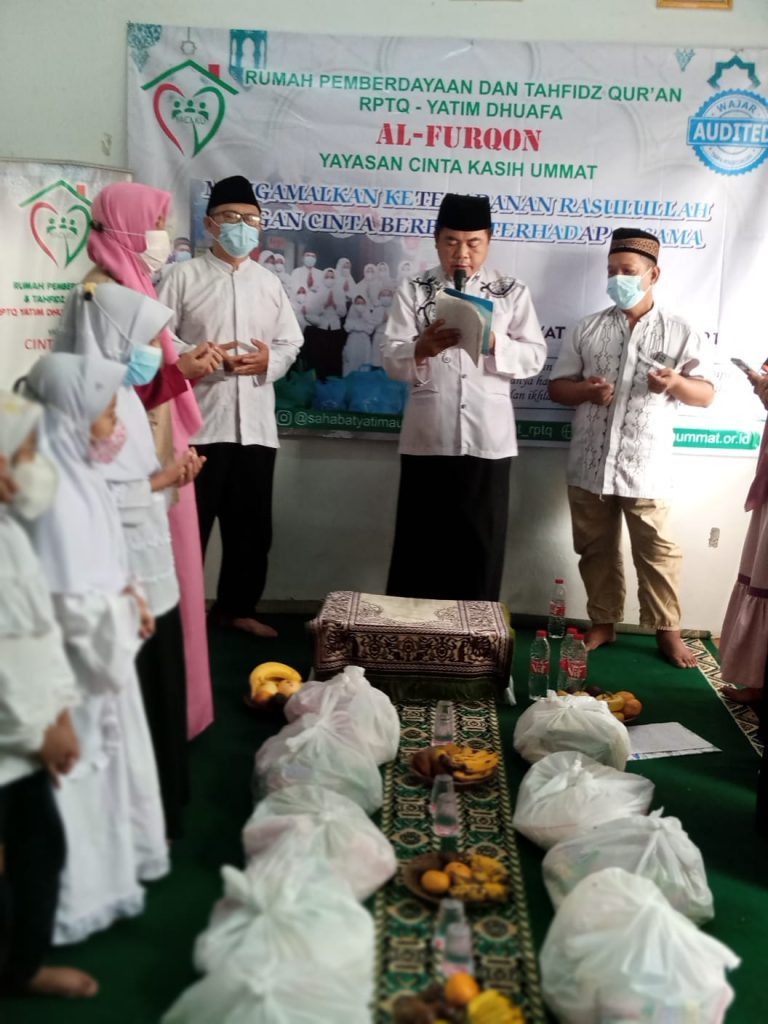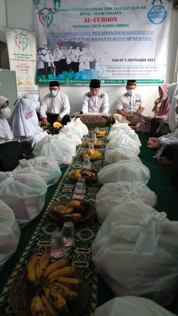 Sebelum acara Maulid Nabi Muhammad SAW, RPTQ Yatim Dhuafa AL FURQON Yayasan Cinta Kasih Ummat telah mengadakan kegiatan pembagian paket Lebaran Yatim Muharram 1443 H.