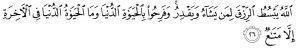 Allah meluaskan rezeki dan menyempitkan nya bagi siapa yang Dia kehendaki. Mereka bergembira dengan kehidupan di dunia, padahal kehidupan di dunia itu (dibanding dengan) kehidupan akhirat hanyalah kesenangan yang sedikit …