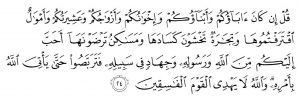 Katakanlah, “Jika bapak bapak mu, anak anak mu, saudara saudara mu, istri istri mu, kaum keluarga mu, harta kekayaan yang kamu usahakan, perniagaan yang kamu khawatiri kerugian nya dan rumah rumah tempat tinggal yang kamu sukai adalah lebih kamu cintai daripada Allah dan Rasul Nya dan (dari) berjihad di jalan Nya, maka tunggulah sampai Allah mendatangkan keputusan Nya”. Dan Allah tidak memberi petunjuk kepada orang orang fasik…